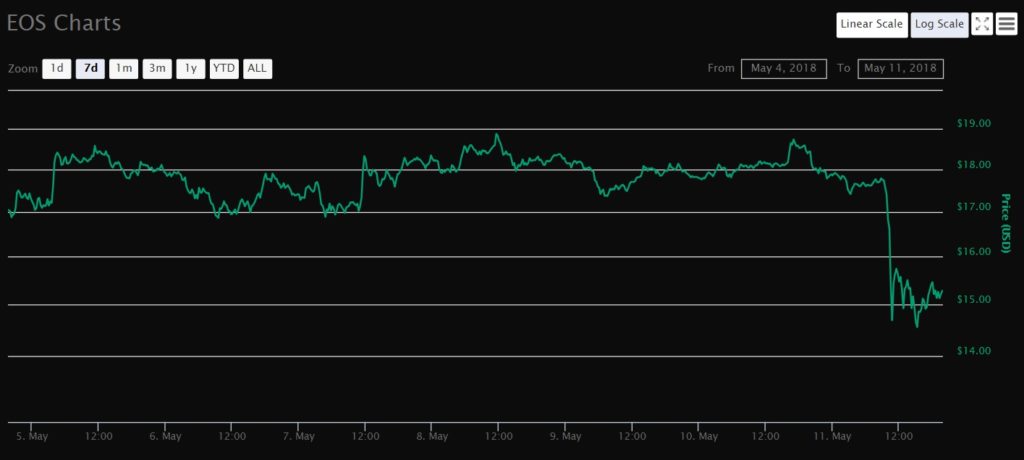 At the moment of this article, EOS (EOS) is trading at $15.19, after declining by a massive 17.19% in the last 24 hours. Yesterday, the crypto coin closed at $17.54, a value orbited by EOS since May 3rd, with an only exception, on May 8th when the coin got closer to $19.